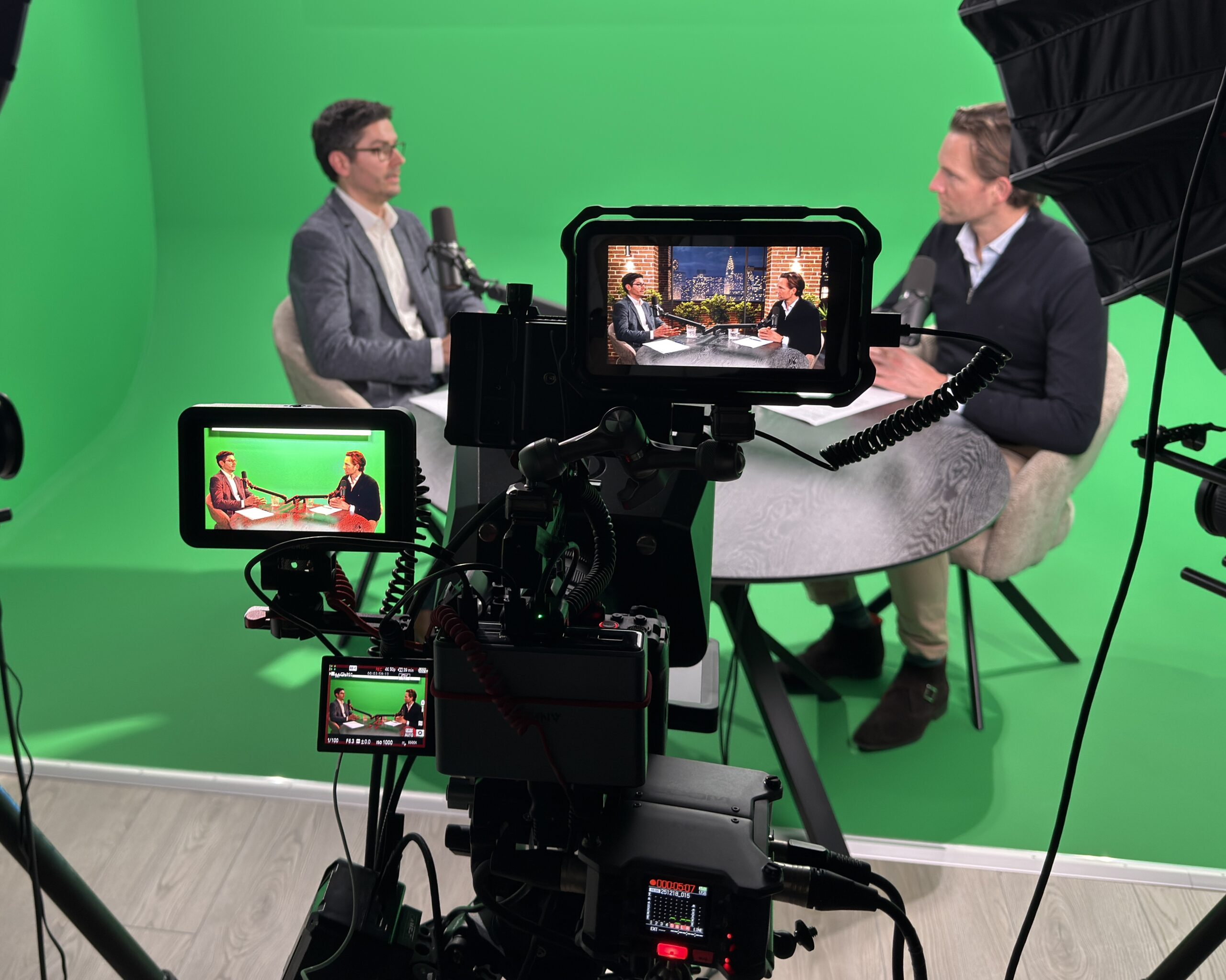 In onze studio combineren we live camera’s met real time camera tracking en Unreal Engine. Daardoor lijkt het alsof je in een echte talkshow setting zit, maar zonder gedoe met decor. Op locatie opnemen kan ook, bijvoorbeeld bij een praktijk, bedrijf of event.